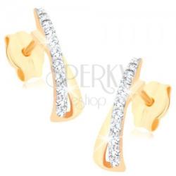 Fülbevaló 9K aranyból egyenetlen szűk hurok alakban. A felső félhold ródiumozott és ezüst színű, továbbá átlátszó cirkóniákból álló vonal díszíti. Az alsó félhold rövidebb és arany árnyalatú sima, fényes felülettel. Biztonságos viselését stekker biztosítja. A fülbevaló méretei: 3 x 11 mmA fülbevaló súlya: 0,6 gFémjelzéssel ellátott. Az ár egy párra von