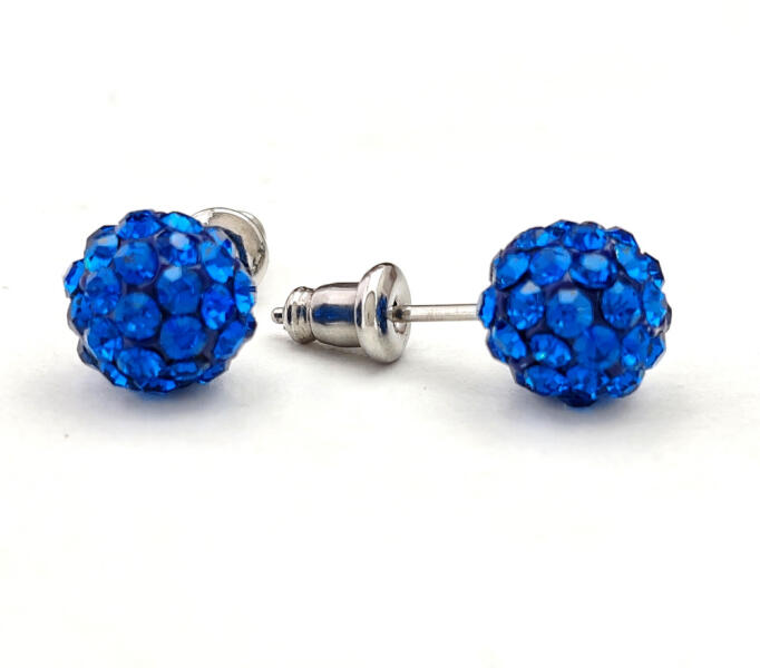 Csillogó tengerkék Swarovski kristállyal díszített shamballa gömb fülbevaló. A fülbevaló alapja ezüstszínű nemesacél. A kristályok ragasztott foglalatban helyezkednek el. Időtálló, mutatós ékszer. Antiallergén ékszer. Fülbevaló átmérője: 8 mm. A nemesacél ékszerek rendkívül népszerűek kedvező tulajdonságaik miatt. A nemesacél semmilyen nikkelsót nem bocsájt ki