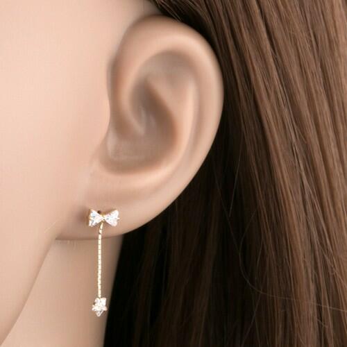 Fülbevaló 14K sárga aranyból csillogó cirkóniás masnival, mely alatt a vékony sűrűn összekapcsolt szögletes szemekből álló láncon átlátszó cirkóniás csillag függ. A fülbevaló kapcsolása stekkeres. Fülbevaló mérete: 7 x 21 mmSúly: 0,7 gFémjelzéssel ellátott. Az ár egy párra vonatkozik.