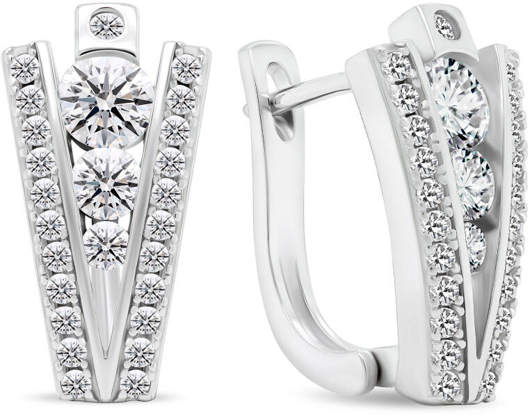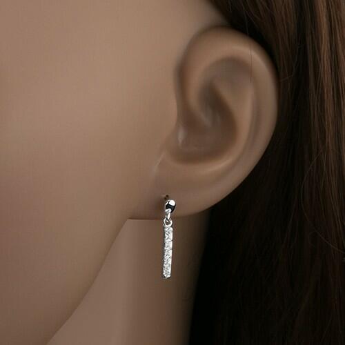 Függő fülbevaló 925 ezüstből, melynek az alapját egy fényes ovális alkotja. Az oválishoz egy vékony téglalap van fogatva, melynek felületén tiszta cirkóniák díszelegnek. A kövecskék körül apró pöttyök vannak gravírozva. Biztonságos viselését a szilikon végdugó biztosítja. A fülbevaló méretei: 2 x 18 mmA fülbevaló súlya: 1,1 gFémjelzéssel ellátott. Az ár egy