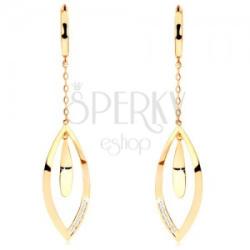 Fülbevaló 14K aranyból, amelyet egy fényes, sima karika alkot, ezen egy láncon függ a tükörfényes búzaszem körvonal. Az alsó részén egy cirkóniákkal kirakott sáv húzódik és középen hosszúkás, levél forma függ. Bepattintós zárral viselhető. Karika szélessége: 1,5 mmBelső átmérő: 11 mmKülső átmérő: 13 mmFüggő rész mérete: 11 x 46 mmFülbevaló súlya: 2,5