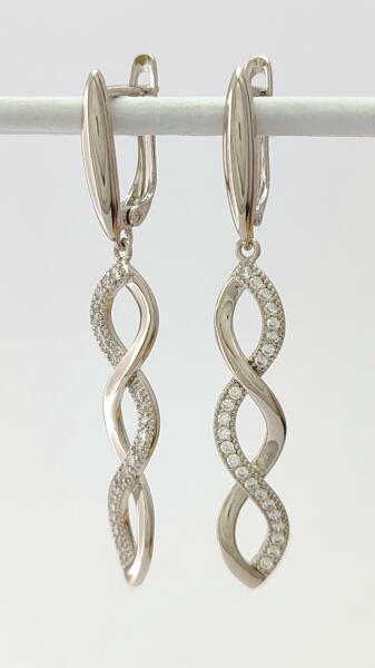 Ezüstszínű fülbevaló, melyet fonott formájú függő díszít és fehér cirkónia kristályok tesznek csillogóvá. A kristályok karmos foglalatban helyezkednek el. Tartós ékszer, fürdéskor nem kell levenni, nem feketedik ("gold filled"). Antiallergén ékszer. Fülbevaló teljes hossza: 48 mm. Kapcsos rész belső hossza: 10 mm. Függő szélessége: 7 mm. Az antiallergén ékszerek o