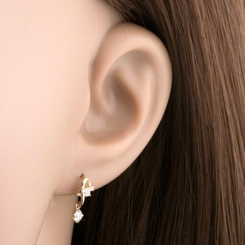 Fülbevaló 14K sárga aranyból két szabálytalan hullámos vonalból, melyek csomót képeznek. A rövidebb vonalat apró átlátszó cirkóniák díszítik, miközben ezen keresztül van áthúzva a fényes sima hullám, ennek a vége kerek átlátszó cirkónia. A fülbevaló kapcsolása stekkeres. Fülbevaló mérete: 4 x 12 mmSúly: 0,66 gFémjelzéssel ellátott. Az ár egy párra vonatkoz