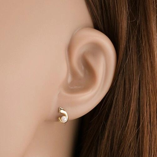 375 arany, bedugós fülbevaló, fényes horogból, amely felülete mérsékelten lekerekített és sima, a félhold alsó részében pedig összeszűkül. A horog alján egy kicsi golyó alakú gyöngy található, fehér színben. A hátsó oldal üreges. Biztonságos viselését stekker biztosítja. A fülbevaló méretei: 5 x 8 mmA fülbevaló súlya: 0,4 gFémjelzéssel ellátott. Az ár egy