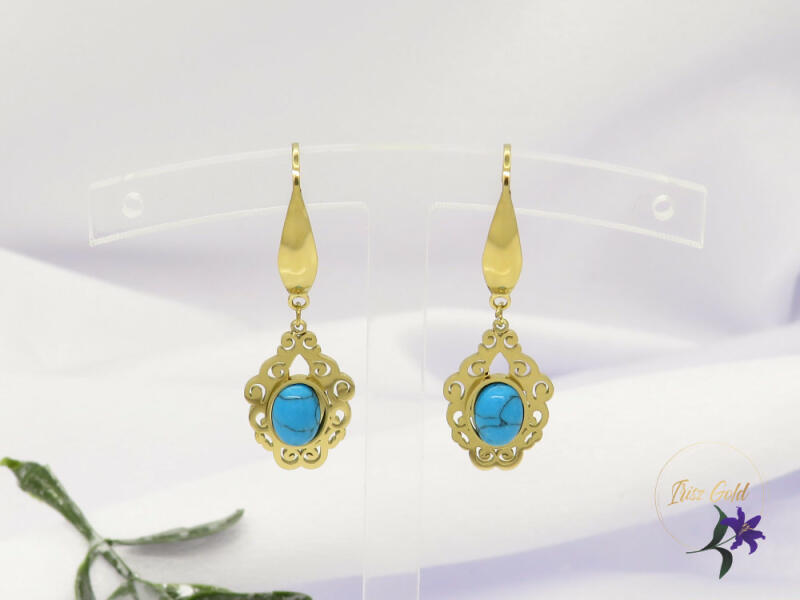Antiallergén csüngős antik hatású kék köves fülbevaló Szin: 14K Méret: 40x14mm Beakasztós a végén szilikon védővel Nemesacél A forgalmazott divatékszerek alapanyaga nikkel és ólommentes ezért többnyire nem okoznak allergiás tüneteket, nyugodtan hordhatják fémérzékeny emberek is. Általában nem színezik a bőrt és más divatékszerekhez képest nagyságrendekkel jobb k