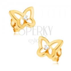 Fülbevaló 9K sárga aranyból lepkekörvonal alakban, mely felszíne sima és tükörfényű, enyhe lekerekített szélekkel. A pillangó közepébe egy apró kerek átlátszó cirkónia van elhelyezve. Biztonságos viselését stekker biztosítja. A fülbevaló méretei: 9 x 7 mm A fülbevaló súlya: 0,6 gFémjelzéssel ellátott. Az ár egy párra vonatkozik.
