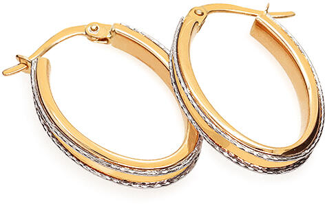 A modern kerek ovális fülbevalók 14 karátos kombinált aranyból készülnek. A fülbevaló felületkezelése gravírozással és ródium bevonattal kombinálva.