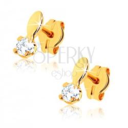 Fülbevaló 9K sárga aranyból gömbölyített szemecskéből, mely alatt egy átlátszó kerek kő található foglalatba helyezve és négy karomal megfogva. Stekkeres kapcsolás. A fülbevaló méretei: 2 x 7 mm A fülbevaló súlya: 0,3 g Fémjelzéssel ellátott. Az ár egy párra vonatkozik.