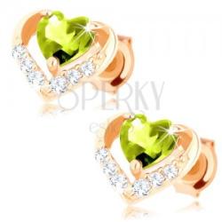 Bedugós, 14K sárga színű arany fülbevaló, vékony, fényes szívecske körvonal alakban, amelynek az alsó része apró, átlátszó cirkóniákkal van díszítve. A kontúr közepének felső részén csiszolt, szív alakú olivin található, világoszöld árnyalatban. Biztonságos viselését a stekker biztosítja. A fülbevaló méretei: 8 x 7 mmA fülbevaló súlya: 0,8 gFémjelzéssel