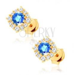 Bedugós fülbevaló 14K sárga aranyból, amelyet egy négyzetes keret alkot kerek, átlátszó cirkóniákkal kirakva. A keret közepébe egy csiszolt, kerek topáz van ültetve kék színben. Biztonságos viselését stekker biztosítja. A fülbevaló méretei: 5 x 5 mmA fülbevaló súlya: 0,6 gFémjelzéssel ellátott. Az ár egy párra vonatkozik.