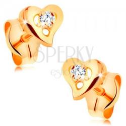 A bedugós 14K sárga arany fülbevaló egy vékony, csillogó, aszimmetrikus szív körvonalból tevődik össze. A szív közepében egy kidomborodó, kerek, átlátszó cirkónia helyezkedik el, négy pálcikával megfogva. Biztonságos viselését stekker teszi lehetővé. Fülbevaló méretei: 4 x 4 mmFülbevaló súlya: 0,3 gFémjelzéssel ellátott. Az ár egy párra vonatkozik.