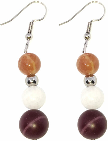 Az ékszer ásványai és tartozékai: – 8 mm-es fehér jade gyöngyök – 10 mm-es matt mookait jáspis gyöngyök – 8 mm-es napkő gyöngyök – Nemesacél díszek Akasztó anyaga rozsdamentes acél. Áruházunkban találsz hozzáillő karkötőt is. Az ékszerben található ásványok jótékony hatásai: NAPKŐ Testünkre: A Napkő erősíti szervezetünk öngyógyító képességét, e