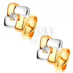 A kombinált 14K arany fülbevalónak négyzet alakja van, amely négy kisebb, fehér és sárga aranyból készült téglalapból tevődik össze. A téglalap alakú sávok összefonódnak egymással. A négyzet közepén egy kerek, átlátszó cirkónia helyezkedik el. Biztonságos viselését stekker teszi lehetővé. Fülbevaló méretei: 6 x 6 mmFülbevaló súlya: 0,6 gFémjelzéssel elláto
