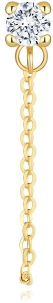 A 14K sárga aranyból készült fülbevaló kerek cirkóniából áll, sima, négyzet alakú tartóba ágyazva. A kosár alsó részén egy rövidebb lánc van rögzítve, amely függőlegesen összekötött ovális láncszemekből áll, amely szorosan kapcsolódik a másik végén lévő fékkel. A fülbevaló stekkeres rögzítéssel rendelkezik. A cirkon rész méretei: 4,5 x 4,5 mmLánc szél
