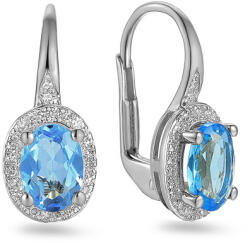 Az elegáns stílusú gyémánt fülbevaló fehér aranyból készült. A díszítés egy központi természetes drágakő topázból áll, melynek össztömege 2240 ct. A követ 52 db 0,130 ct össztömegű, H színű és SI1 tisztaságú gyémánt veszi körül. A női patentos zárás gondoskodik arról, hogy a fülbevaló biztosan a helyén maradjon, így nem kell attól tartanod, hogy kiesnek
