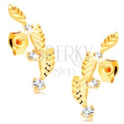 14K sárga arany fülbevaló összekapcsolt levélkékből álló ívvel, nagyság szerinti elrendezéssel. Mindegyik levelet csillogó bevágások és kerek átlátszó cirkónia díszít. A fülbevaló kapcsolása stekkeres. Méret: 17 x 5 mmSúly: 0,8 gFémjelzéssel ellátott. Az ár egy párra vonatkozik.