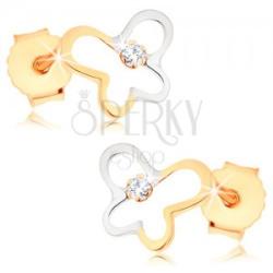 Fülbevaló 9K aranyból kis pillangó körvonallal, mely egyik fele fehér a másik fele padig sárga aranyból készült. A körvonalba kerek csillogó átlátszó cirkónia található. A fülbevaló kapcsolása stekkeres. A fülbevaló méretei: 8 x 6 mm A fülbevaló súlya: 0,4 gFémjelzéssel ellátott. Az ár egy párra vonatkozik. A ródiummal kezelt felület az ékszer tartósságát, ke