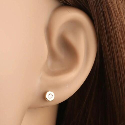 14K sárga arany fülbevaló, kis karika sima felülettel. Középen egy csillogó cirkónia helyezkedik el. Biztonságos viselését csavaros stekkerzár teszi lehetővé. Fülbevaló átmérője: 5 mmSúly: 0,36 gFémjelzéssel ellátott. Az ár egy párra vonatkozik.