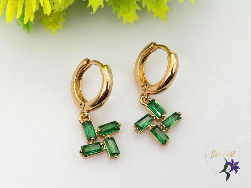 Antiallergén kiskarika fülbevaló zöld köves csüngővel Szin: 18K Méret: 22x10mm Zár: karika átmérő 10 mm A forgalmazott divatékszerek alapanyaga nikkel és ólommentes ezért többnyire nem okoznak allergiás tüneteket, nyugodtan hordhatják fémérzékeny emberek is. Általában nem színezik a bőrt és más divatékszerekhez képest nagyságrendekkel jobb kopásállósággal rendel
