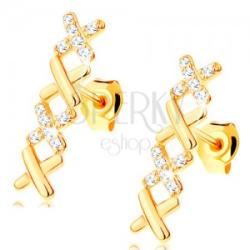 Csillogó fülbevaló 14K sárga aranyból, négy kis keresztből álló vonalból. Egymás mellett váltakozva helyezkednek el a sima és csillogó átlátszó cirkóniákkal kirakott keresztek. A fülbevaló kapcsolása stekkeres. Méret: 4 x 16 mmSúly: 1 gFémjelzéssel ellátott. Az ár egy párra vonatkozik.