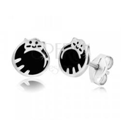 925 ezüst fülbevaló macskát ábrázolva, összegömbölyödve. A cica arca felismerhető (szemek, száj és bajusz), hátsó lábak és farok. A hátán három fényes sáv húzódik. Az első részén elhelyezkedő mélyedések, fekete fénymázzal vannak fedve. Zárszerkezete stekkeres. Fülbevaló mérete: 7 x 7 mmSúly: 0,9 gFémjelzéssel ellátott. Az ár egy párra vonatkozik.