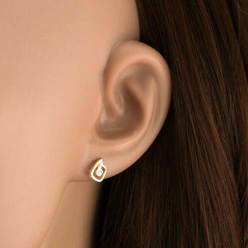 Bedugós kétszínű fülbevaló 9K aranyból asszimetrikus négyzet kontúr sárga aranyból, amely közepén egy kisebb négyzet található fehér aranyból átlátszó kerek kővel. A fülbevaló felülete ródiumozott. Biztonságos viselését stekker biztosítja. A fülbevaló méretei: 6 x 8 mmA fülbevaló súlya: 0,4 gFémjelzéssel ellátott. Az ár egy párra vonatkozik. A ródiummal ke