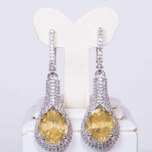 Ezüst Fülbevaló 10.5 Karátos Ural Citrinnel és Fehér Topázzal, súlya kb. : 8.85 gramm KÓD: Y17248 Ékszer mérete: 14 mm x 45 mm Kapocs típusa: Bepattintós Francia v. Berlini kapocs Minden drágaköves ékszerünk eredetiséget igazoló tanúsítvánnyal érkezik, ami igazolja az ékszer nemesfém eredetiségét, és az ékszerben lévő drágakő karátszámát. Ezüst és arany éksze