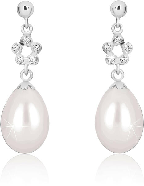 A fülbevaló fehér 9K aranyból készült. A fülbevaló alapja egy kis félgömb, tükör sima felülettel. A félgömb alsó részén egy virág lóg, öt lekerekített szirommal. A szirmokat átlátszó kerek cirkóniák díszítik. A virág közepén egy kör alakú kivágás található. A fülbevalót egy fehér színű, könnycsepp alakú édesvízi gyöngy zárja. A gyöngyöt egy apró