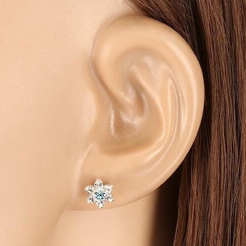 A 925 ezüst fülbevaló kétszínű cirkónia virág formájú. A virág közepébe egy kerek, égszínkék cirkónia van beültetve. Az égszínkék cirkóniát csillogó, átlátszó cirkóniák veszik körül. Stekkeres zárszerkezet. A fülbevaló mérete: 7 x 7 mmA fülbevaló súlya: 0,9 gFémjelzéssel ellátva. Az ár egy párra vonatkozik.