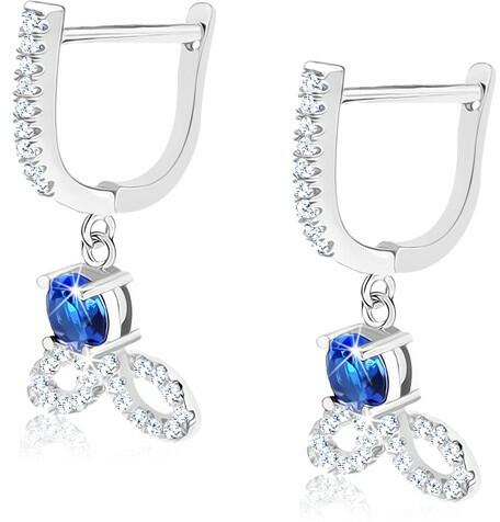 925 ezüst fülbevaló függőleges átlátszó cirkóniákkal kirakott vonallal, mely alatt kerek sötétkék cirkónia található csiszolt felszínnel. A cirkónia alatt dekoratív két összekapcsolt szemkörvonal található átlátszó cirkóniákkal kirakva. A fülbevaló kapcsolása orosz patent és a felszíne ródiummal van ellátva. Fülbevaló mérete (kapcsolással): 14 x 28 mmFülbev