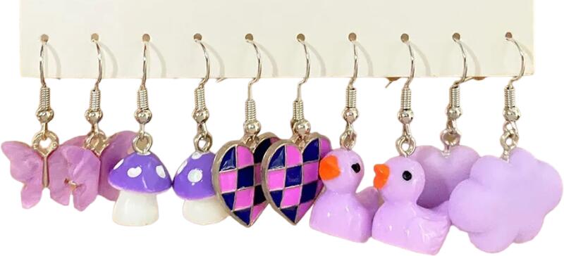Fantazy Fülbevalószett Fantazy fülbevalószett szuper áron. A szett 5 pár különböző formájú, méretű és díszítésű fülbevalót tartalmaz. Nem tartalmaz nikkelt, ezért érzékeny bőrű emberek is viselhetik. Tulajdonságok: Anyaga: Fém és cink ötvözete Szín: Ezüst/Lila A fülbevalók mérete: kb. 3,5cm