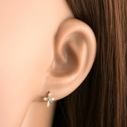 Bedugós fülbevaló 9K sárga aranyból kereszt alakban, amely szárai kerek, átlátszó cirkóniákkal vannak kirakva. Középre egy kiemelkedő kék topáz van helyezve kerek alakban. Biztonságos viselését stekker biztosítja. A fülbevaló méretei: 8 x 9 mmA fülbevaló súlya: 0,52 gFémjelzéssel ellátott. Az ár egy párra vonatkozik.