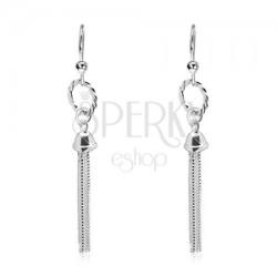 A 925 ezüst fülbevalót csavart kötél mintás karika alkotja, amelyen hosszú bojt függ. A bojtot apró szögletes elemekből álló keskeny, fényes láncok alkotják. A fülbevaló afriakai horgokon függ apró golyóval. Díszes rész méretei: 8 x 38 mmTeljes hossz (kapoccsal): 52 mmFülbevaló súlya: 2,7 gFémjelzéssel ellátott. Az ár egy párra vonatkozik.