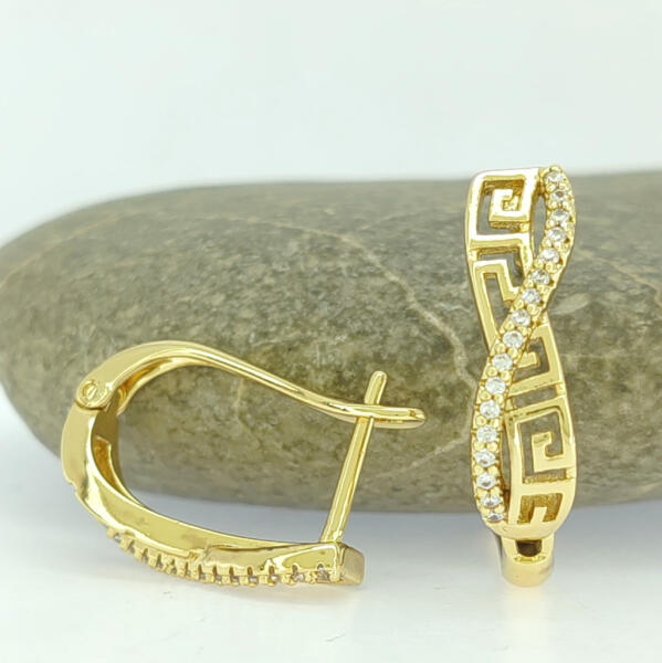 Aranysárga színű fülbevaló, melyet fehér cirkónia kristályok tesznek csillogóvá és áttört görög minta díszít. A kristályok karmos foglalatban helyezkednek el. Időtálló darab, nem kopik, nem feketedik, nem színezi a bőrt. Antiallergén ékszer, nem okoz panaszokat fémérzékeny hölgyeknek sem. 14K arany színben kapható. Fülbevaló szélessége: 6 mm. Kapcsos rész belső