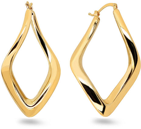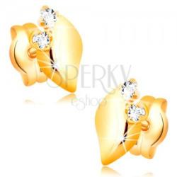 A sárga 14K aranyból készült briliáns fülbevalót egy levél enyhén hullámos vonala alkotja. A levél felső részében két kiemelt kerek, átlátszó gyémánt található, mindegyik négy pálcával rögzítve. Biztonságos viselését stekker teszi lehetővé. Fülbevaló méretei: 5 x 8 mmEgy gyémánt átmérője: 1,5 mmGyémántok teljes súlya: 0,06 ctTisztaság: SISzín: H-IFülbe