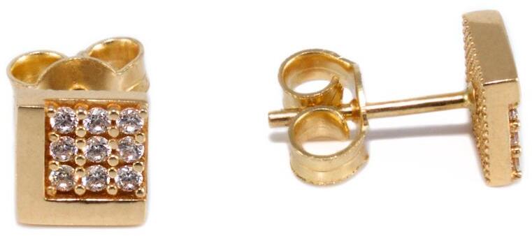 Klasszikus és kedvelt fazonú, cirkónia kővel ékített, szögletes kocka arany fülbevaló.