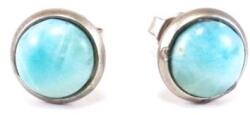 Kaboson csiszolású nagyon ritka, természetes Larimar (Larimár, kék pektolit, vagy delfin kőként is ismert) 6mm-es befoglalt bedugós (stiftes, stekker ) fülbevaló. Gyönyörű ég-kék színű, szinte hibátlan, felhőszerű rajzolatú drágakő. A fülbevaló alapja úgy van kialakítva, hogy a szélén kicsi perem fogja körbe a beragasztott kaboson formára csiszolt ásványt. Nem kell