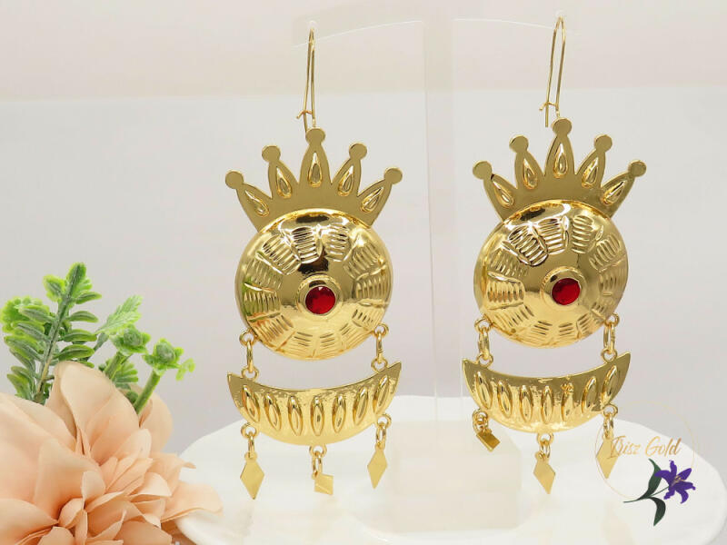 Gyönyörű antiallergén roma fülbevaló. Nagy központi dísz középen piros kövek , alsórésze csüngős Szin: 18K Méret: 12 cm x4 cm Akasztó nélküli hossz 9 cm A forgalmazott divatékszerek alapanyaga nikkel és ólommentes ezért többnyire nem okoznak allergiás tüneteket, nyugodtan hordhatják fémérzékeny emberek is. Általában nem színezik a bőrt és más divatékszerekhez k