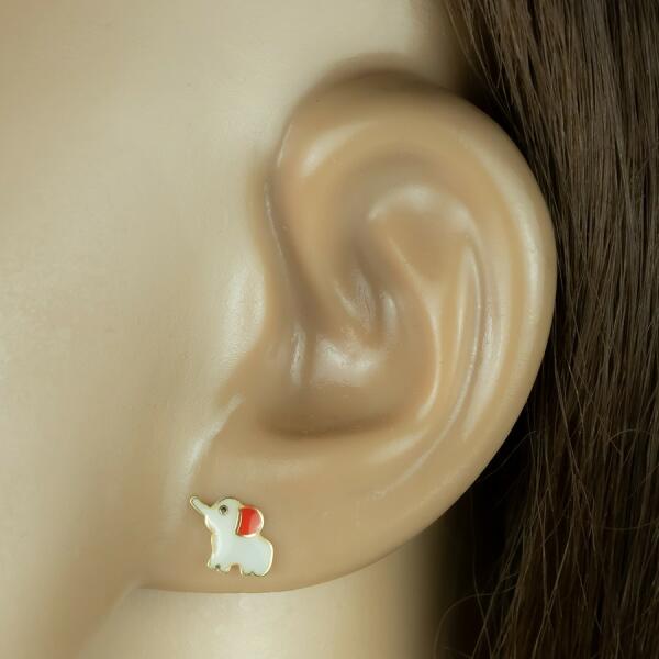 A 9K sárgaarany fü lbevalót felemelt ormánnyal e lefánt motívum díszíti, amely fényes fehér mázzal bevonva. Az elefánt füle lazac színű, egy apró szeme fekete. Az elefánt körvonala és az egyes részeket elválasztó vonalak arany színűek. A fülbevaló stekkerzárral rendelkezik . A fülbevaló méretei: 8,5 x 7 mmA fülbevaló súlya: 0,4 gFémjelzés – van. Az ár egy pár