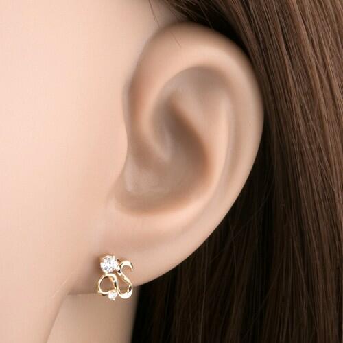 Fülbevaló 14K sárga aranyból fényes hullámos szalaggal. A felső részében egy nagyobb kerek átlátszó cirkónia található az alsó részén pedig kisebb átlátszó cirkónia van. A fülbevaló kapcsolása stekkeres. Fülbevaló mérete: 8 x 9 mmSúly: 0,7 gFémjelzéssel ellátott. Az ár egy párra vonatkozik.