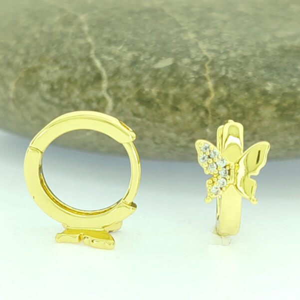 Aranysárga színű karika fülbevaló, melyet fehér cirkónia kristályok tesznek csillogóvá és pillangó motívum díszít. A kristályok karmos foglalatban helyezkednek el. Időtálló darab, nem kopik, nem feketedik, nem színezi a bőrt. Antiallergén ékszer, nem okoz panaszokat fémérzékeny hölgyeknek sem. 14K arany színben kapható. Fülbevaló szélessége: 7 mm. Karika belső át