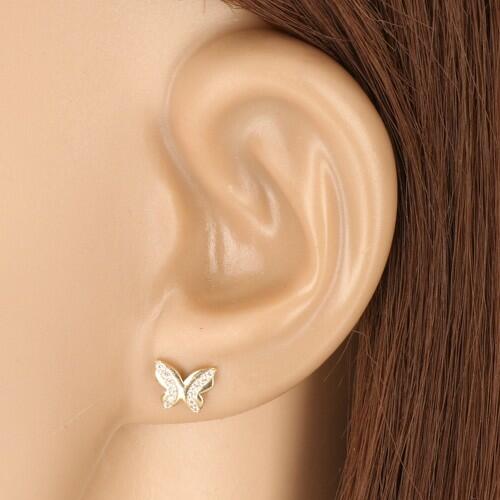 A 375 sárga arany fülbevaló pillangó alakú. A szárnyakat két enyhén ívelt szimmetrikus vonal díszíti. Az ívek átlátszó, kerek cirkóniákkal vannak kirakva. A fülbevaló felülete sima és fényes. Stekkeres zárszerkezet. A fülbevaló mérete: 7 x 6 mmA fülbevaló súlya: 0,6 gFémjelzéssel ellátva. Az ár egy párra vonatkozik.