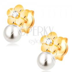 A sárga 14K aranyból készült briliáns fülbevalót gravírozott szirmú virág alkotja, amely szorosan összekacsolódik egy kerek alakú, fehér gyönggyel. A virág közepén egy csillogó, csiszolt, átlátszó gyémánt található. A virág hátoldala üreges. Biztonságos viselését stekker teszi lehetővé. Fülbevaló méretei: 5 x 9 mmEgy gyémánt átmérője: 1,5 mmGyémántok tel