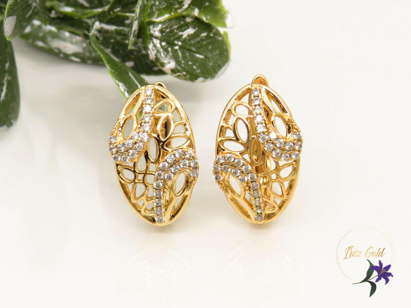 Goldfilled gyönyörű csipkemintázatú fülbevaló tűcirkóniával díszítve Szin: 18K Méret: 18x10mm Zár: franciakapocs A forgalmazott divatékszerek alapanyaga nikkel és ólommentes ezért többnyire nem okoznak allergiás tüneteket, nyugodtan hordhatják fémérzékeny emberek is. Általában nem színezik a bőrt és más divatékszerekhez képest nagyságrendekkel jobb kopásállósá