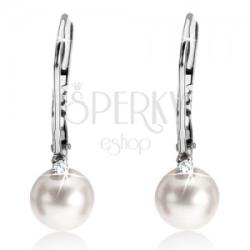 Fülbevaló 9K fehér aranyból vékony egyenes pálcikán, amelyhez egy apró, átlátszó cirkónia is erősítve van. A cirkónia alatt egy tenyésztett fehér gyöngy található. A fülbevaló pattintós kapoccsal záródik. A fülbevaló méretei: 6 x 21 mmA fülbevaló súlya: 1,3 gFémjelzéssel ellátott. Az ár egy párra vonatkozik. A tenyésztett gyöngy apró idegen anyag behelyezés