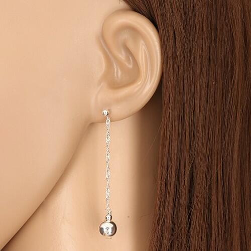 A fülbevaló 925 ezüstből készült, alapja egy kis gyöngy, amelyen csillogó lánc lóg. A lánc sűrűn egymásba kapcsolt rombusz alakú szemekből áll, amelyek spirál hatását keltik. A láncon egy nagyobb gyöngy függ, amire egy kisebb van rögzítve. A gyöngyök felülete sima, tükörfényes. Bedugós, stekkeres kivitel. A fülbevaló mérete (zárszerkezettel együtt): 8 x 54 mmA