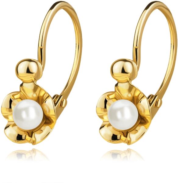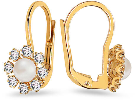 Elegáns fülbevaló 14 karátos sárga aranyból. A fülbevalót fehér Biwa folyógyöngy és cirkónia díszíti, amely virág alakban veszi körül.