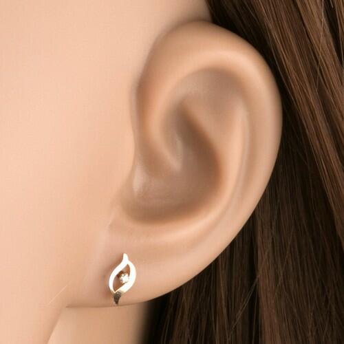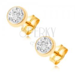 Arany fülbevaló 585 fényes sima kerek alakú foglalattal, melyben kis átlátszó cirkóniák vannak beültetve. Beszúrós kapcsolás. Átmérő: 5 mmA fülbevaló súlya: 0,4 g Az ár egy párra vonatkozik. Fémjelzéssel ellátott.