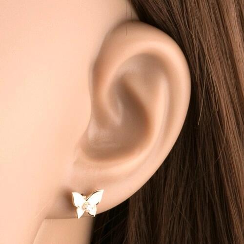 Fülbevaló 9k sárga aranyból kicsi pillangóval fényes, sima felülettel. A pillangó szárnyai fehér fénymázzal vannak fedve és egy átlátszó cirkónia díszíti az alsó részben. Biztonságos viselését stekker biztosítja. A fülbevaló méretei: 8 x 7 mmA fülbevaló súlya: 0,68 gFémjelzéssel ellátott. Az ár egy párra vonatkozik.