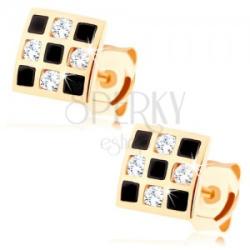 Fülbevaló 14K sárga aranyból négyzet alakban mérsékelten kidomborodó felülettel, amelyet egy sakktábla minta alkot. A sakktáblát fekete fénymázzal és átlátszó cirkóniákkal díszített négyzetek borítják, kerek alakban. Biztonságos viselését stekker biztosítja. A fülbevaló méretei: 5 x 5 mmA fülbevaló súlya: 0,6 gFémjelzéssel ellátott. Az ár egy párra vonatkozi
